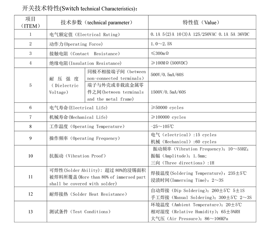 | 1 | Elektrik Derecelendirmesi | 0.1A 5(2)A 10(3)A 125/250VAC 0.1A 5A 36VDC | |